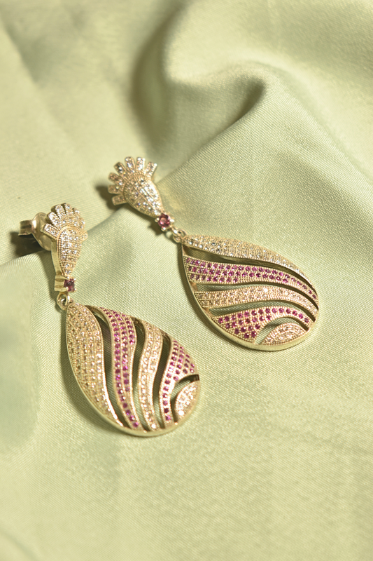 Elegant Waves Gold-Plated Teardrop Earrings with Ruby Accents