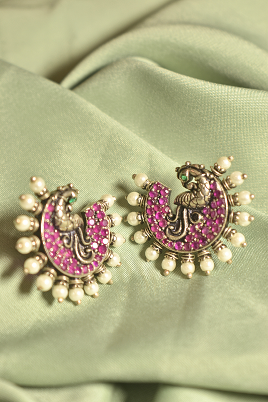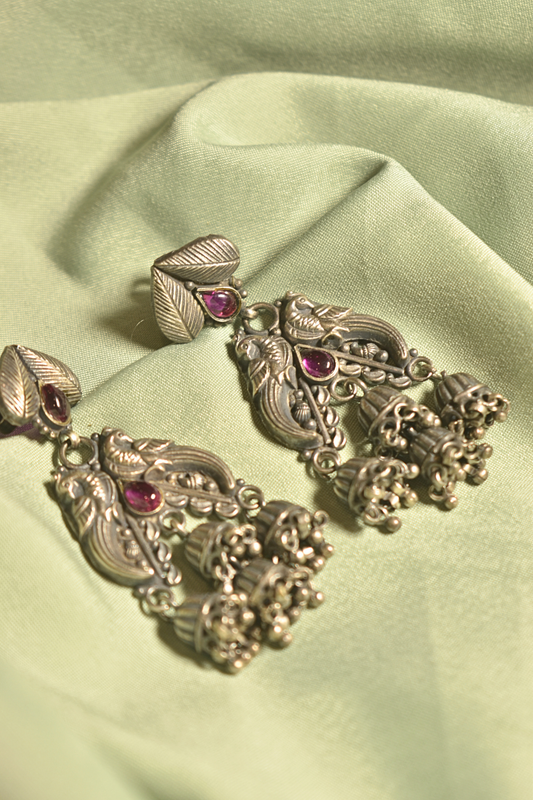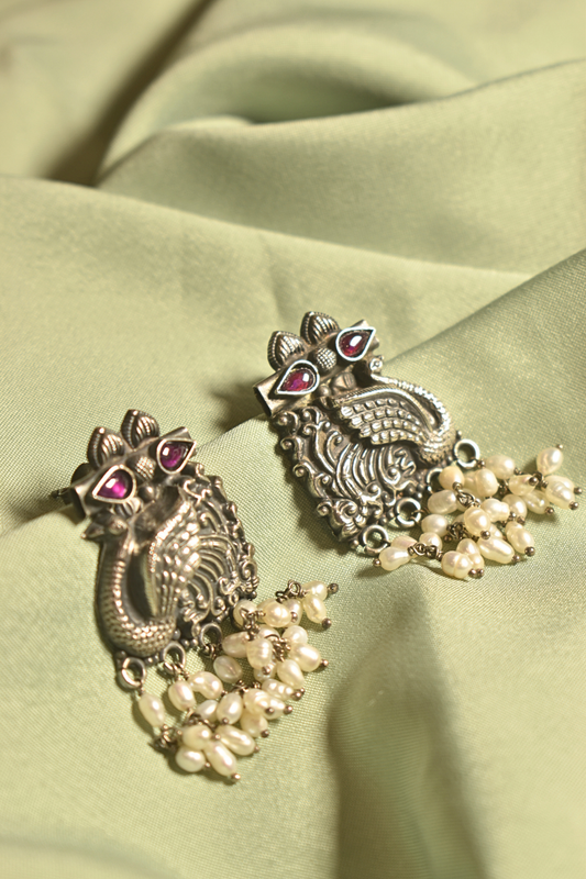 Peacock Splendor Intricate Silver Danglers with Ruby Highlights