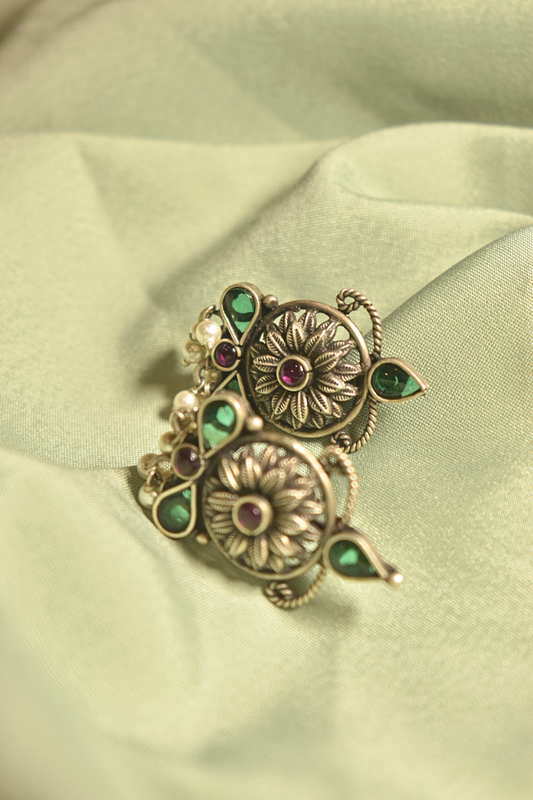 Vintage Bloom Floral Silver Earrings with Emerald Accents