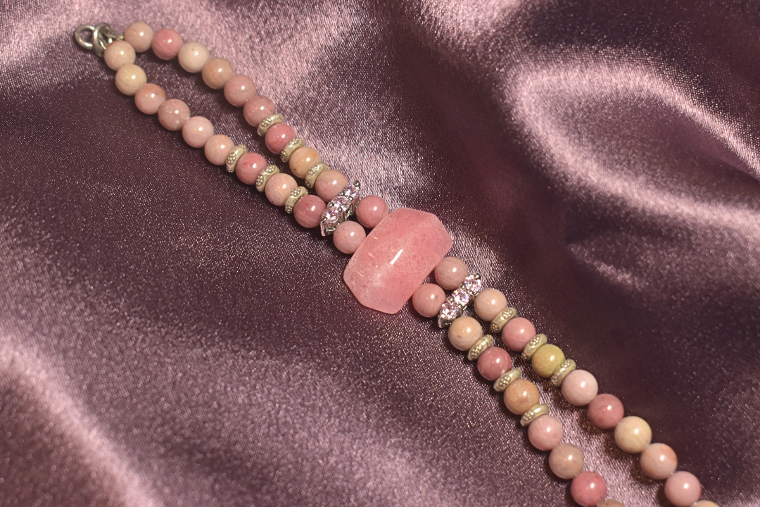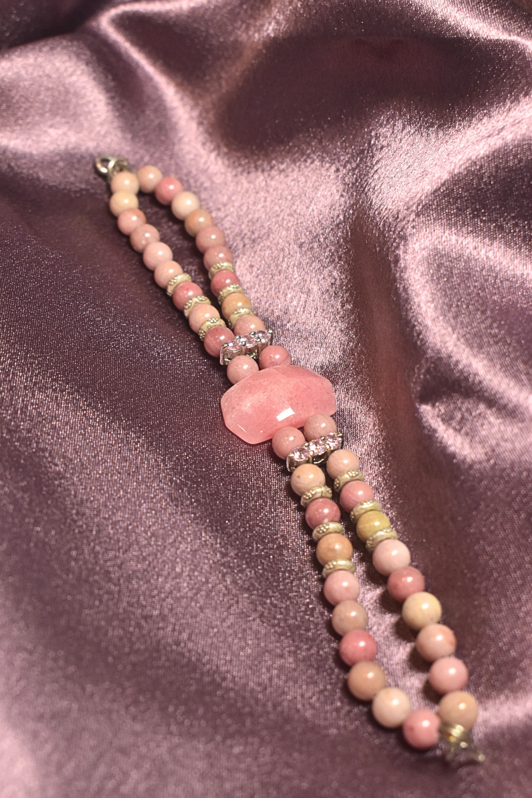 Blush Pink Beaded Bracelet with Crystal Accents and Centerpiece Charm