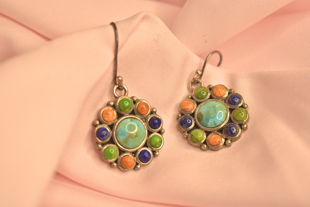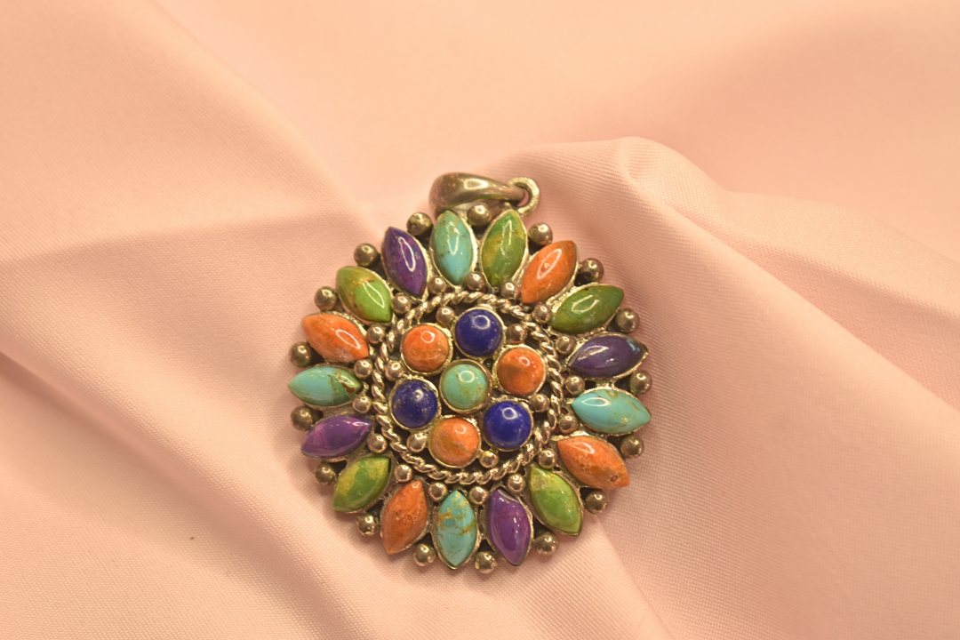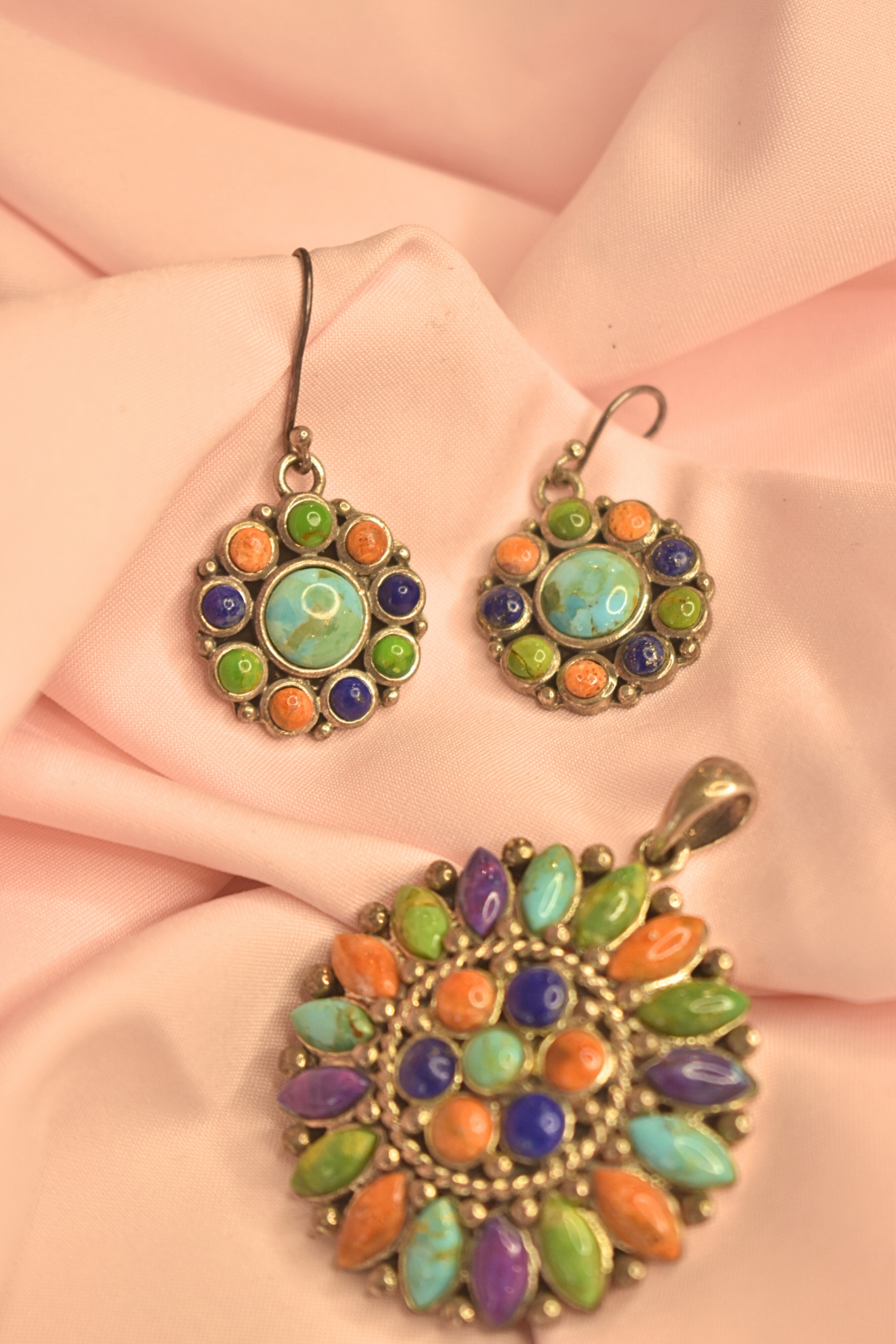 Colorful Stone-Studded Earrings and Pendant Set with Vibrant Floral Design