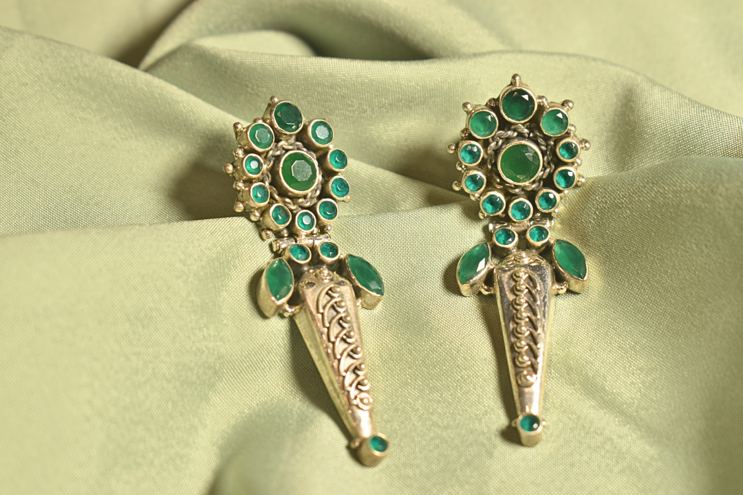 As an expert in the jewelry industry, I can confidently assert that the Emerald Majesty Ornate Green Gemstone Earrings are an exquisite addition to any collection. With a stunning emerald gemstone and ornate design, these earrings offer a touch of elegance and sophistication. Make a statement with these beautiful earrings.