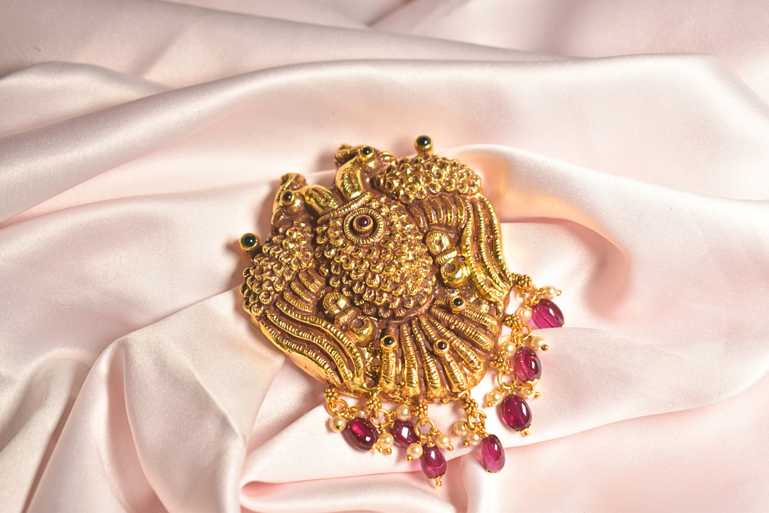 Add a touch of elegance to any outfit with our Exquisite Gold Peacock Pendant. The intricate design and vibrant ruby and pearl embellishments make this pendant a must-have for any jewelry lover. Made with high-quality materials, this pendant is both luxurious and timeless.