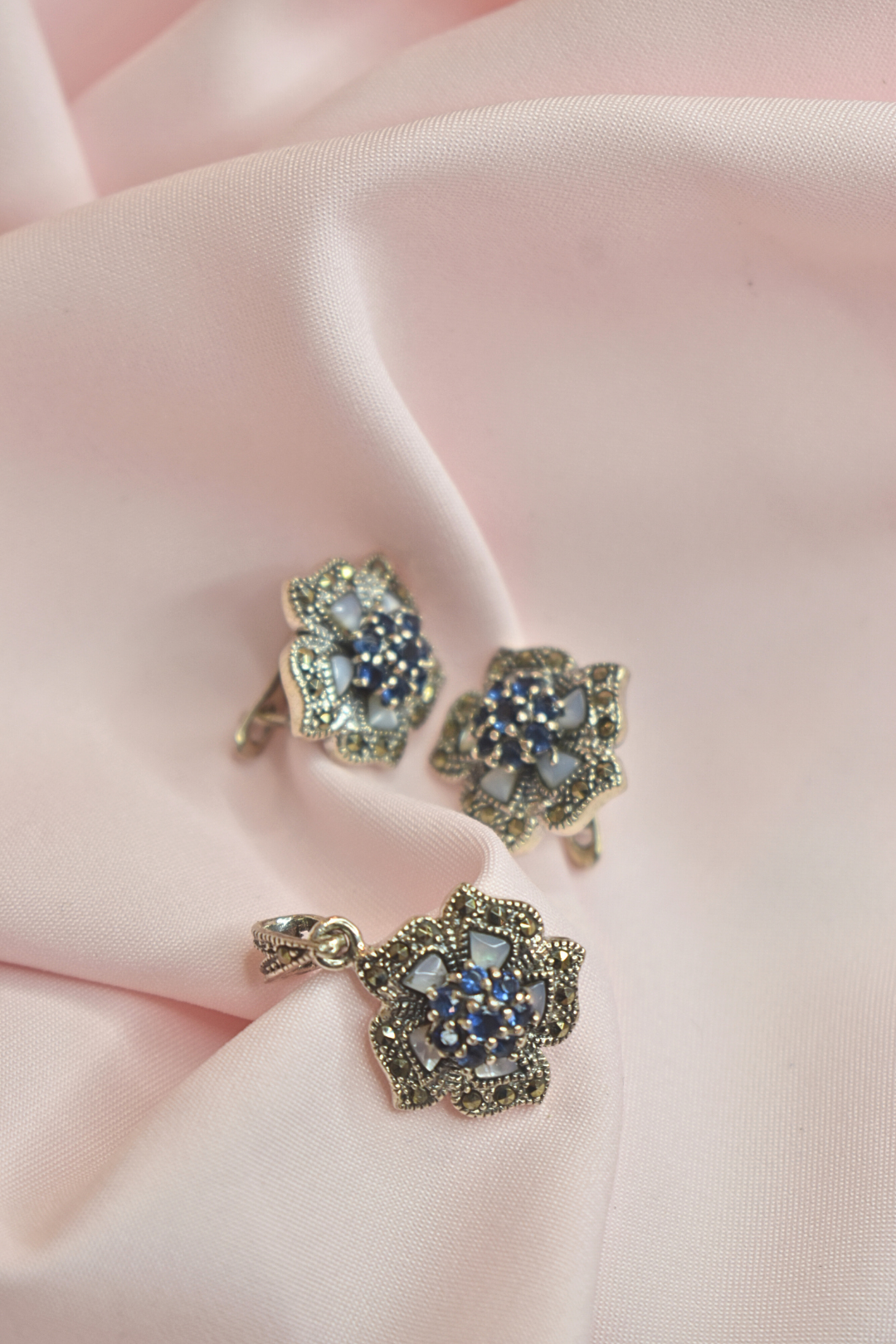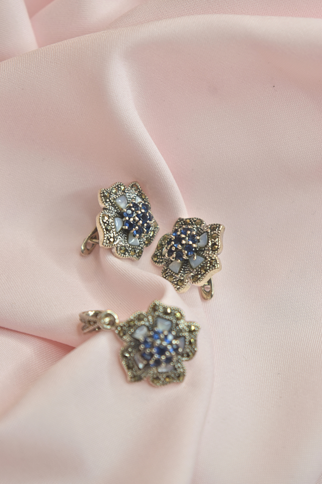Experience the sophisticated delicacy of our Floral Elegance Earrings and Pendant Set. Expertly crafted with intricate floral designs, this set exudes elegance and charm. Elevate any outfit with this stunning set and make a statement with its timeless beauty.