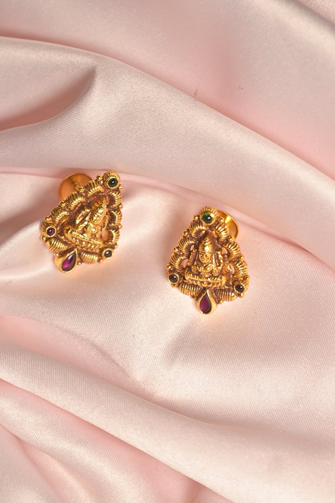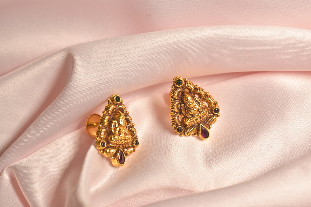 Introducing our elegant and timeless Gold-Plated Lakshmi Stud Earrings. Made with high-quality materials, these earrings feature a beautiful gold plating and intricate Lakshmi design. Perfect for adding a touch of sophistication and cultural significance to any outfit.