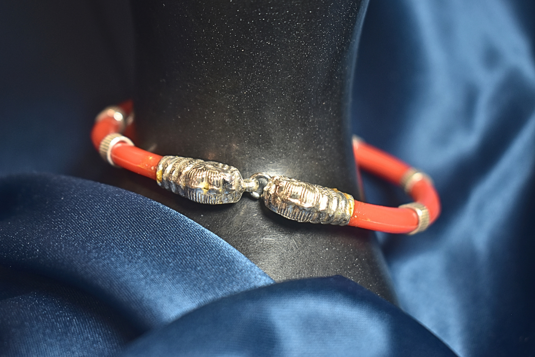 Expertly crafted with high-quality materials, this handcrafted silver bracelet in a stunning red hue is the perfect addition to any jewelry collection. Its unique design and attention to detail make it a timeless and versatile piece that can elevate any outfit. Made to last and impress, this bracelet is a must-have for any fashion-savvy individual.