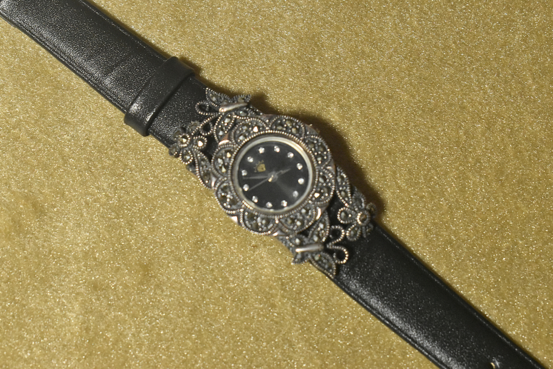 Exude elegance with our Intricate Floral Timepiece. Featuring a beautiful floral design on the face, this watch is truly a work of art. The sleek black leather strap adds a touch of sophistication, making it the perfect accessory for any occasion.