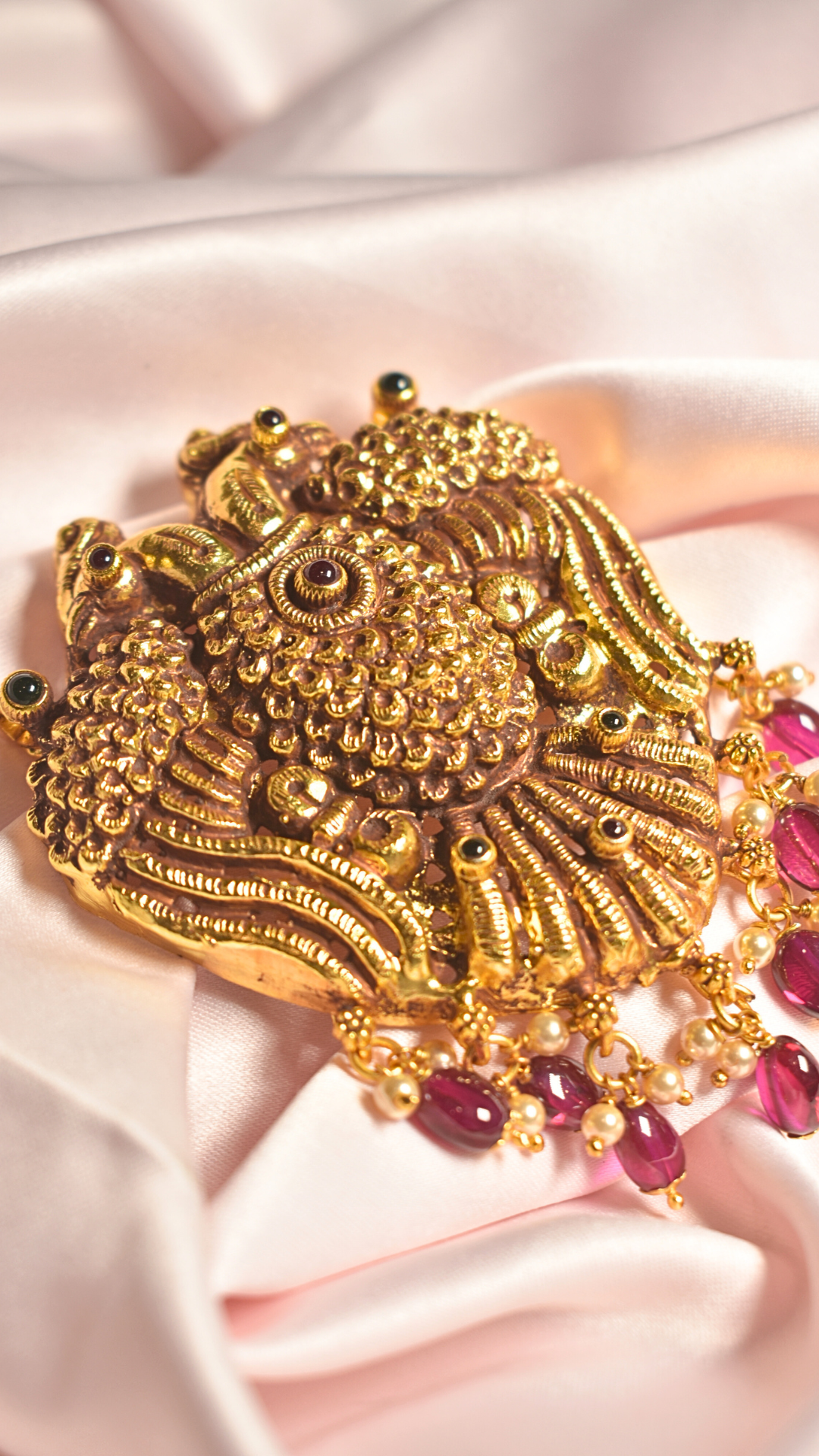 This exquisite Majestic Gold Peacock Pendant is truly a sight to behold. Crafted with intricate detailing and embellished with lustrous pearls, it exudes elegance and grace. Made from high-quality gold, this pendant will surely elevate any outfit and make a statement. Perfect for any occasion, it's a must-have for any jewelry collection.