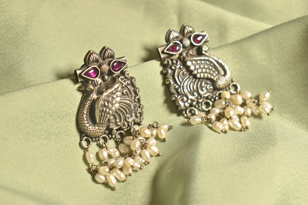 These stunning earrings feature a majestic peacock design crafted in silver, adorned with lustrous pearl drops. Elevate any outfit with the elegant touch of these hand-crafted earrings. The intricate design and quality materials make them a unique addition to any jewelry collection.