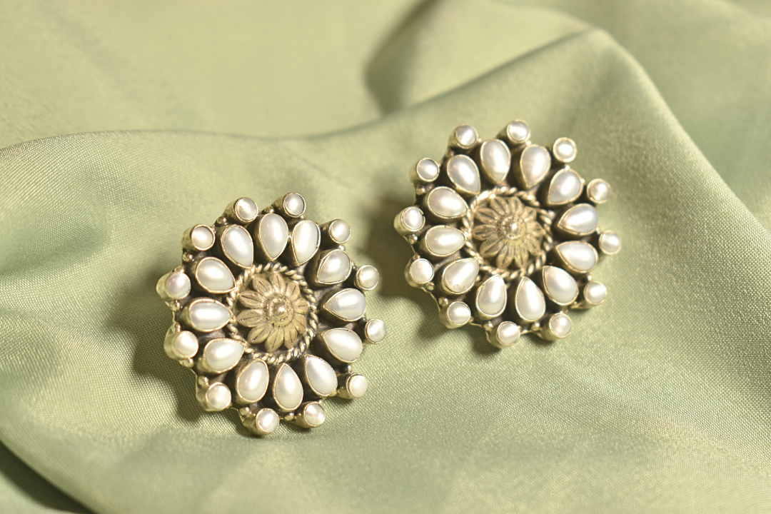 Experience elegance and sophistication with our Pearl Radiance Floral Silver Stud Earrings. Each stud features a delicate floral design and a lustrous pearl, creating a timeless and graceful look. Made with high-quality silver, these earrings are perfect for any occasion. Elevate your style with these stunning earrings.