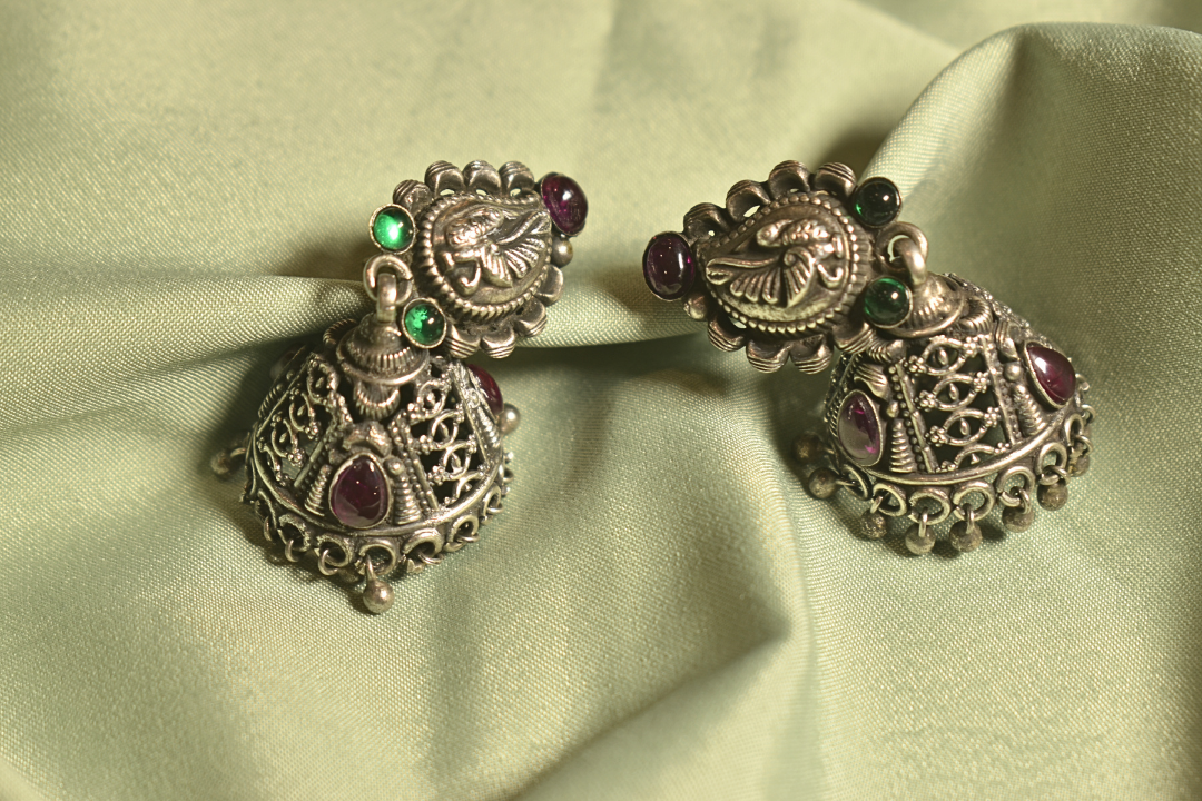 Regal Enchantment Intricate Silver Jhumkas with Gemstone Details