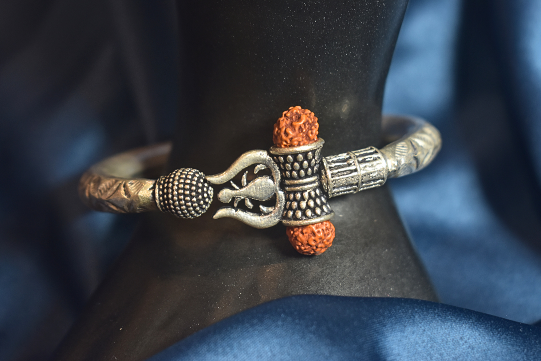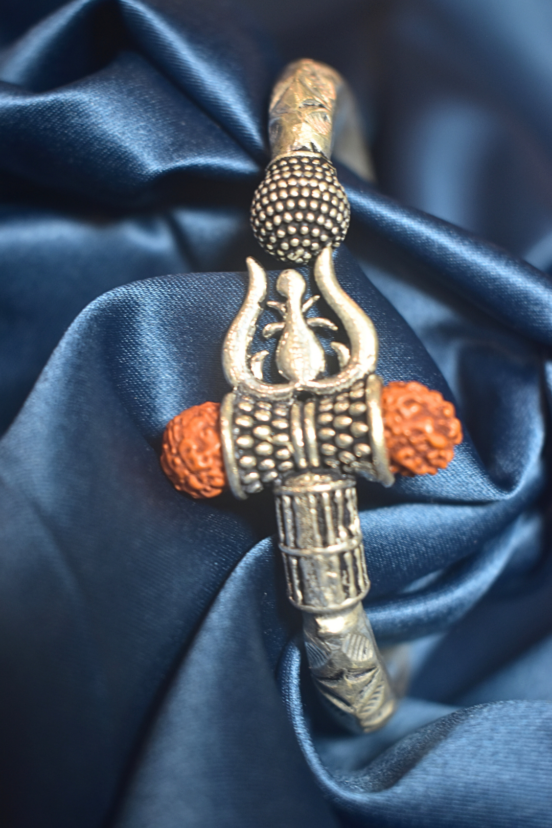 Spiritual Silver Kada with Rudraksha and Trishul Design