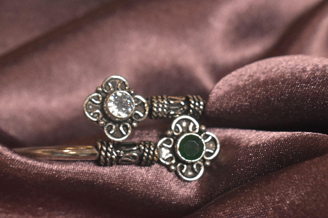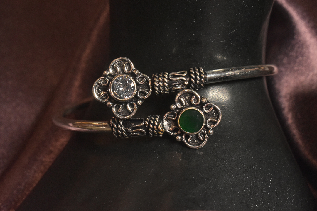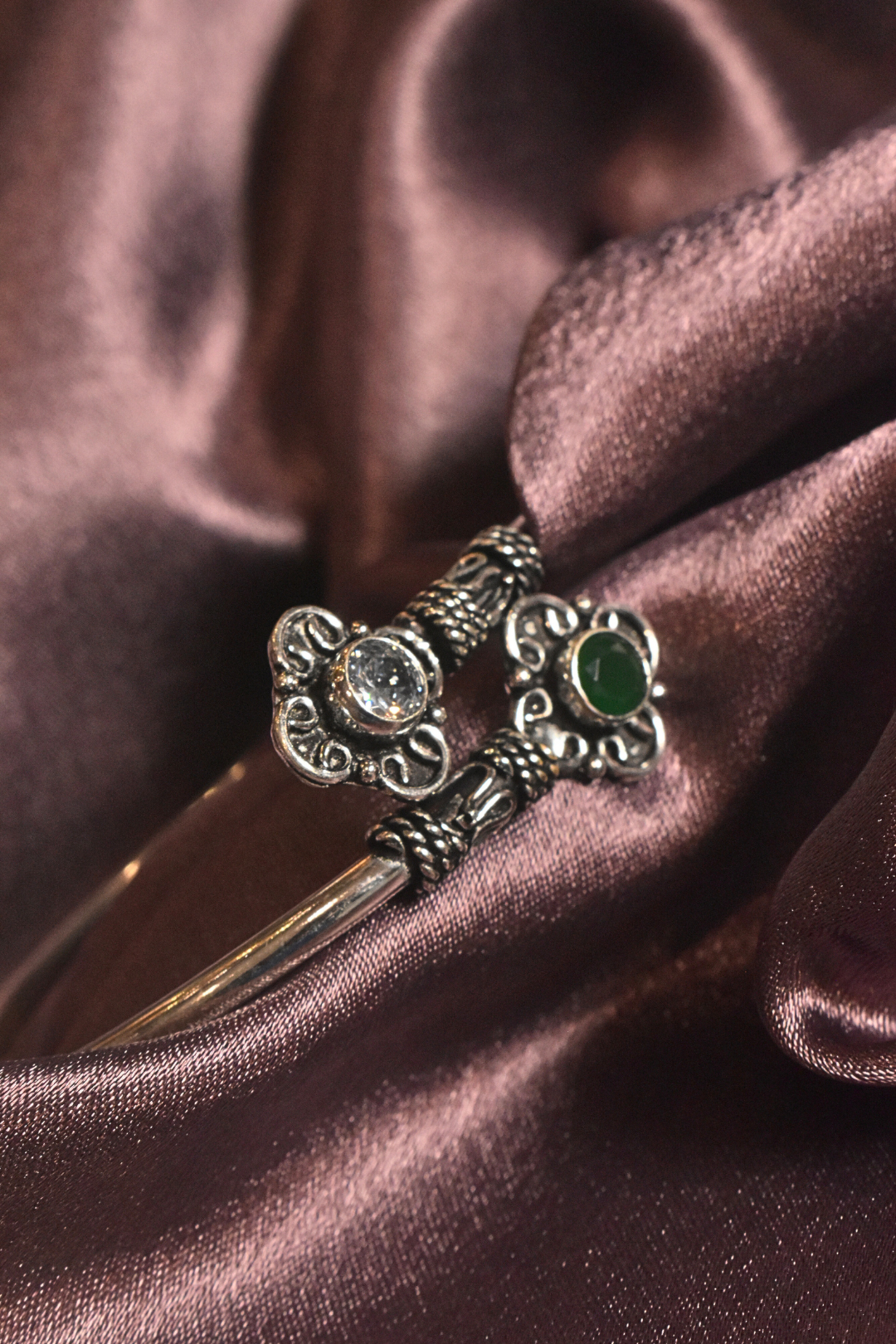 Vintage Charm Dual Stone Open Bangle with Ornate Floral Design